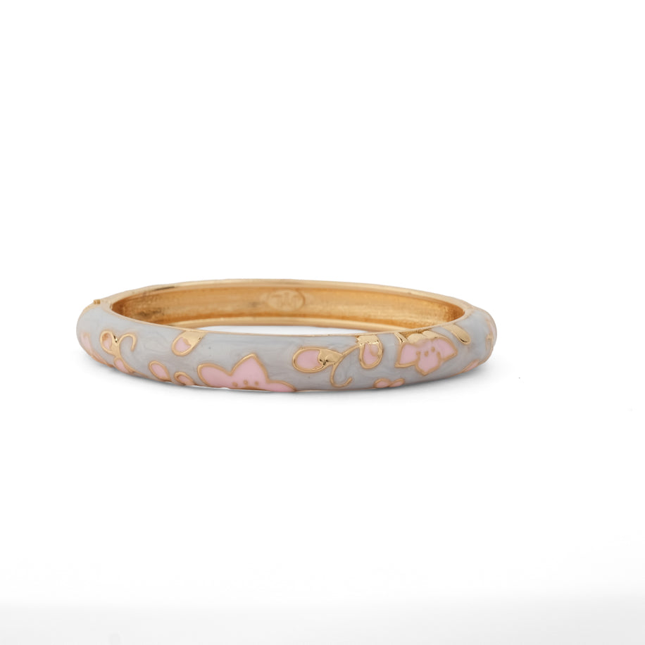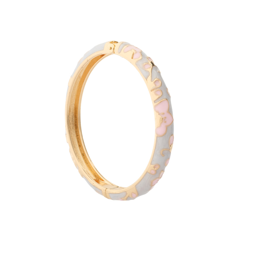 Blossom Whisper bilezik, zarif pembe ve gri tonlarıyla işlenmiş minik çiçek motifleriyle romantik bir şıklık sunar. Altın kaplama üzerine ince işçilikle yerleştirilmiş detaylar, günlük kombinlerinize zarafet katarken özel günlerde de sofistike bir dokunuş sağlar.