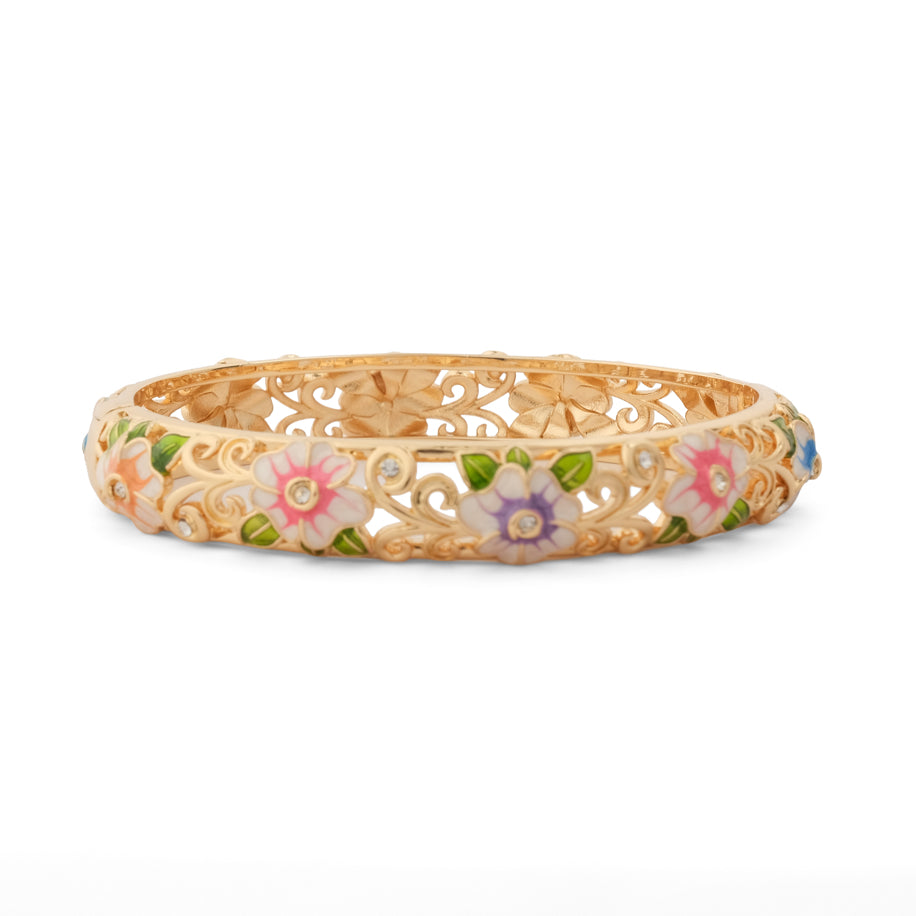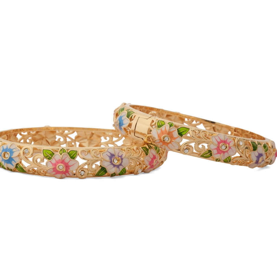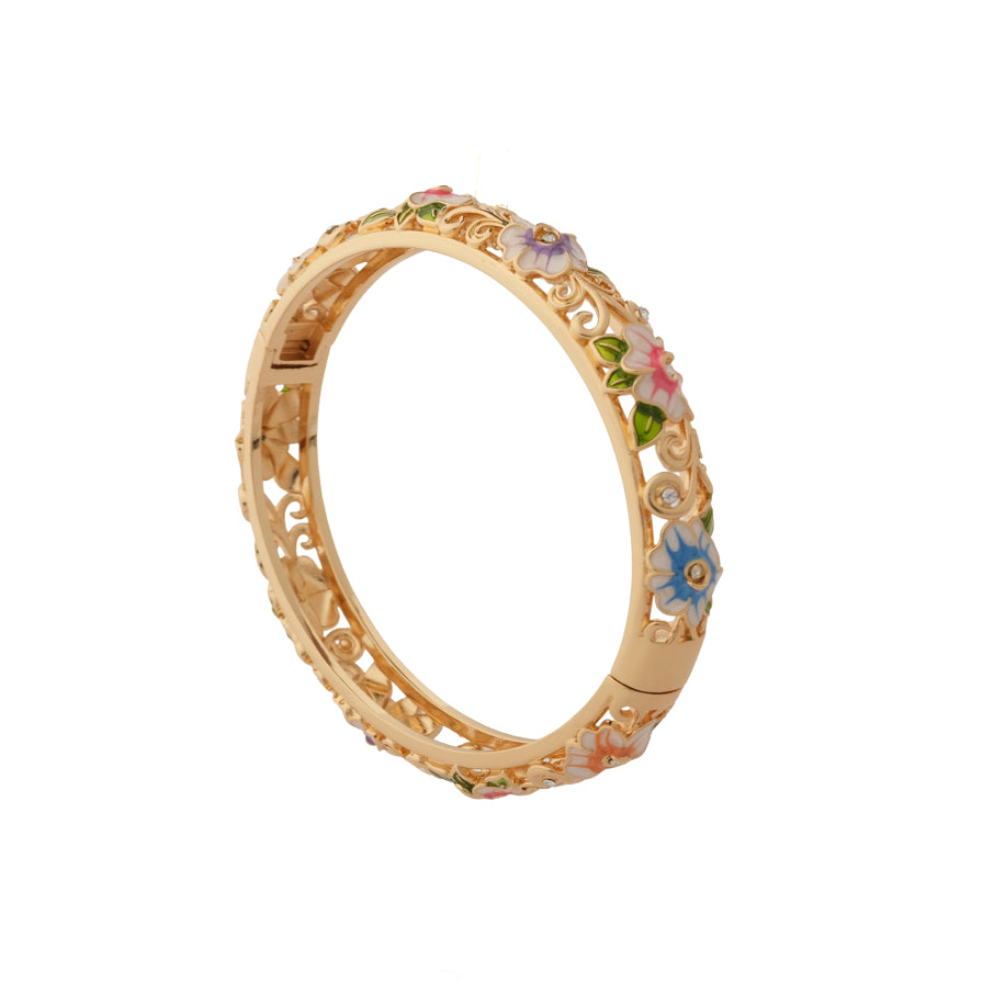 Doğanın renkli dokusunu taşıyan Flora Enchant bilezik, el işçiliğiyle işlenen zarif çiçek detayları ve canlı renkleriyle göz kamaştırıyor. Altın tonunun sıcaklığı, pembe, mor ve mavi çiçeklerle birleşerek romantik ve feminen bir görünüm sunuyor.