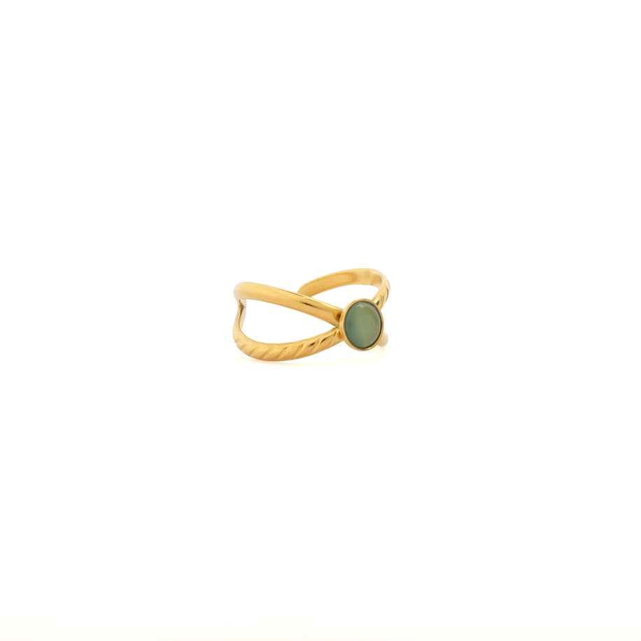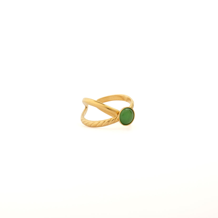 Sage ,minimalist tasarımı ve zarif yeşil taş detayıyla doğal şıklığı yansıtır. Altın kaplama yüzüğün çapraz detaylı formu, modern ve zarif bir görünüm kazandırır. Hem günlük kombinlerinize hem de özel davetlere uyum sağlayarak sofistike bir dokunuş sunar.